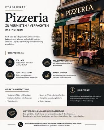 Nach über 30 erfolgreichen Jahren wird eine bekannte und sehr gut laufende Pizzeria in absolut zentraler Lage im Stadtkern zur Übernahme angeboten.
